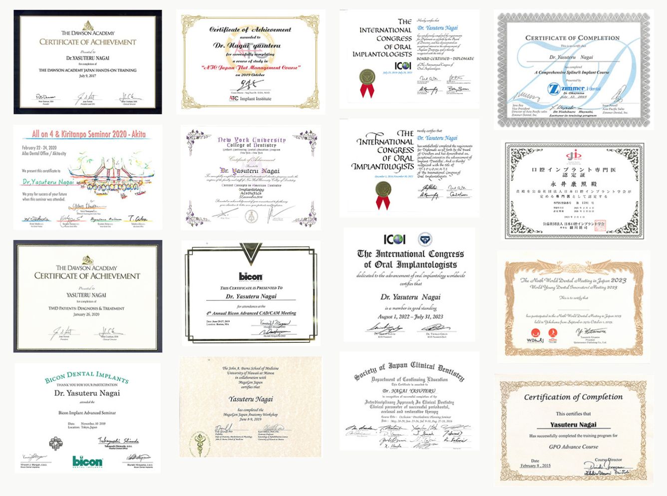 「骨の状態によりインプラントが困難」「噛み合わせの再構築が必要」 そうした複雑な症例に対し、客観的な診査・診断に基づいた複数の選択肢を提示するため、当院では国内外の学術団体における専門的な研鑽を継続しています。院内に掲示している認定証や修了証は、科学的根拠に基づいた治療計画を立案するための、知識と技術の習得を示すものです。日本口腔インプラント学会専門医や、国際的なインプラント学術団体(ICOI)指導医(Diplomate)といった認定資格は、特定の術式や管理体制において一定の基準を満たしていることを証明しています。年間埋入本数418本(2025年1月〜12月当院実績)という実績は、こうした地道な研鑽と、症例ごとの丁寧な振り返りによって積み上げられたものです。私たちは、現在のお悩みに対し、学会が示すガイドラインに沿った適切なアプローチをもって、お口の健康を支える治療計画を共につくり上げることを大切にしています。
