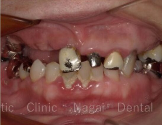 | 背景 | 歯の不調を感じながらも、さまざまなご事情から10年以上歯科医院へ通われていませんでした。上顎は右側のブリッジや前歯の差し歯が外れた状態で、左側にもむし歯が見られました。食事はやわらかいものを中心に摂取できていましたが、「しっかり噛めるようになりたい」という強いご希望をお持ちでした。精密検査の結果、上顎の歯は中長期的に残せる歯が少ない状態であることが分かりました。そこで、上顎はインプラントとブリッジを組み合わせたAll-on-4による治療をご提案しました。下顎については、奥歯の状態は良好とは言えないものの、前歯に比較的良い歯が残っており、またご予算のご事情も踏まえ、今回は治療を行わない方針としました。将来的に下顎の治療を行う際にもバランスよく仕上がるよう、上顎の補綴設計を患者様と相談しながら決定しています。 |