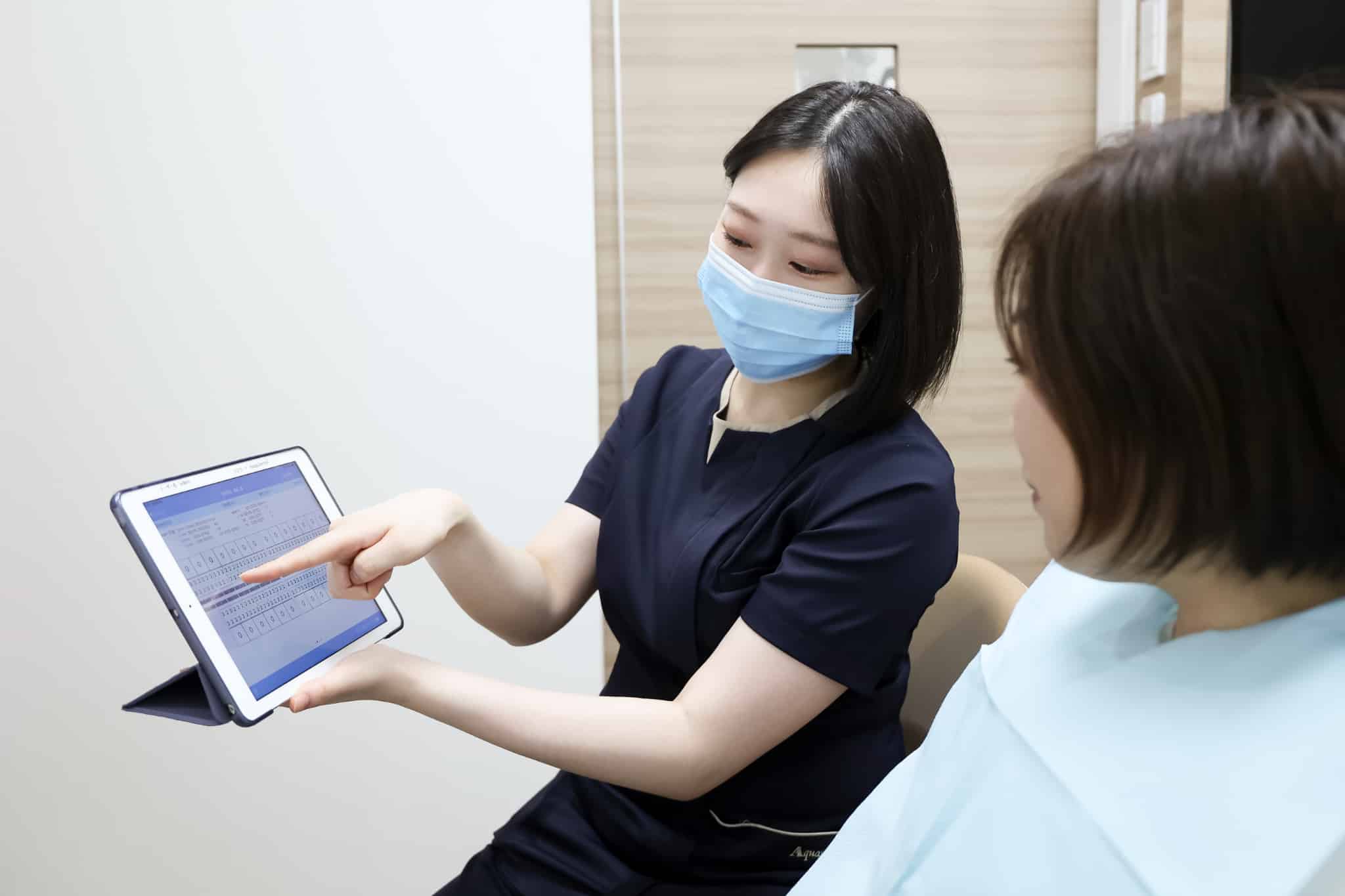 続いて、一次検査としてお口の中を詳しく確認します。歯周病の有無や歯周ポケットの状態、むし歯のチェックなどを行い、現在のお口の健康状態を細部まで調べます。正確な診断を行うための大切な工程であり、重度の歯周病が見つかった場合には、治療計画の立案に先立ち、歯周病治療を優先することがあります。